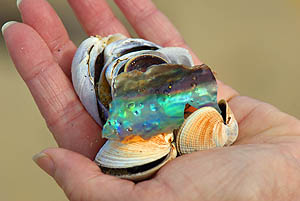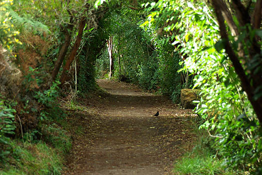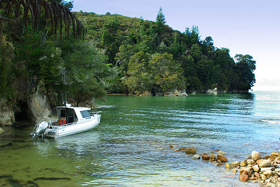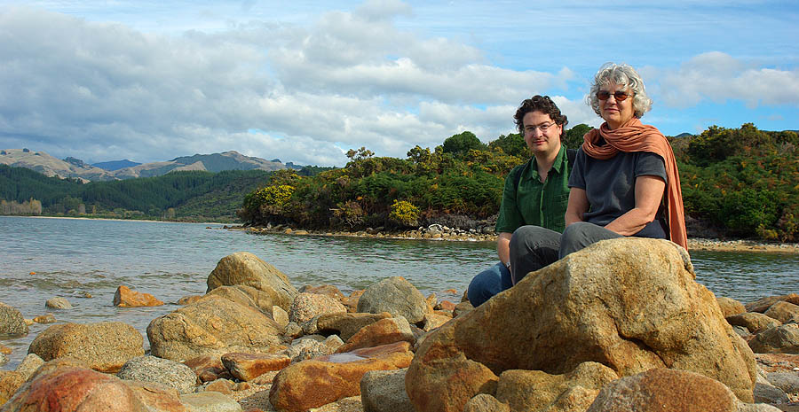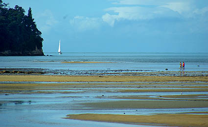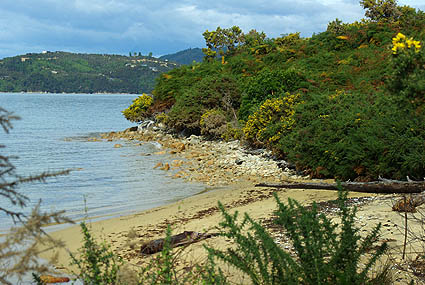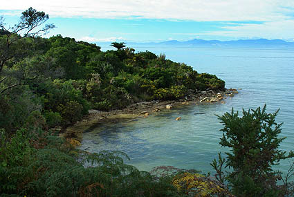 La végétation originelle protégée reprend peu à peu ses droits, et une chasse sans merci aux rongeurs importés donne un répit à de nombreuses espèces d'oiseaux. On a été vraiment fascinés par l'extraordinaire variété de la flore, en particulier des fougères, qui passent par toutes les couleurs et stages de développement sur le même pied. On y voit plein d'oiseaux discrets mais peu farouches, hérons, huitriers, silvereye, etc. Vous trouverez des photos de ces plantes et animaux dans les galeries dédiées, à la fin de ce carnet de voyage. ![]() Depuis le sentier on accède à des petites criques de sable fin et d'eau verte, pleines de coquillages, mais malheureusement aussi de "sand flies", ces mini-moustiques horripilants. Une légende maorie prétend même qu'ils ont été créés par une déesse qui craignait que les humains s'attardent trop dans ces lieux enchanteurs, et voulait leur donner une bonne raison pour en partir.