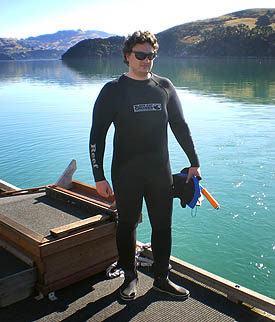 L'eau n'étant qu'à quelques degrés, même à la sortie de la baie abritée (les courants arrivent tout droit de l'antarctique), on est équipés de combinaisons