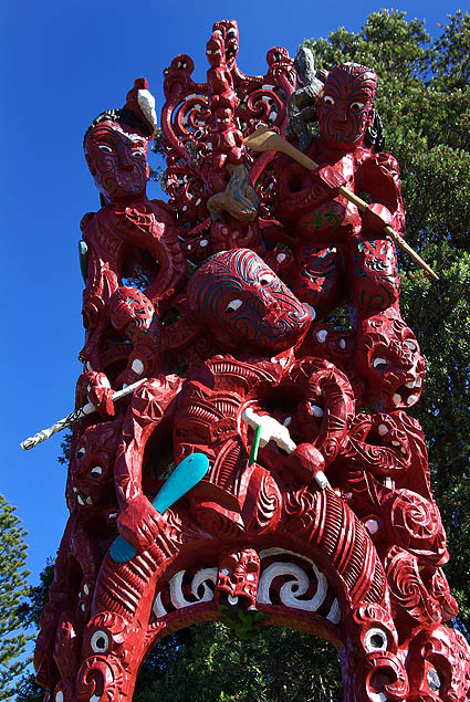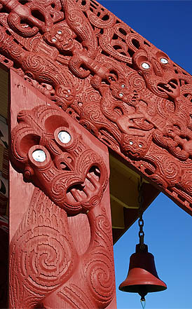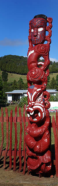 La région est l'une des plus actives pour les populations maories. La plupart des villages possèdent de superbes totems et "marae" (maison commune - ci-dessous celle de Tukaki à Te Kaha) ; on capte des radios en langue maorie ; on croise des jeunes avec des tatouages traditionnels... Après avoir été niée pendant des décennies de colonisation anglaise, puis dénigrée, cette culture originale renaît, accompagnée de revendications parfois virulentes concernant notamment les terres tribales autrefois vendues pour une poignée de pièces et quelques bouteilles d'alcool, aujourd'hui réclamées pour être exploitées par les descendants des tribus (iwi). Pour en savoir plus, voir notamment l'histoire du traité de Waitangi, texte fondateur de l'autonomie des Maoris au sein de l'empire britannique.