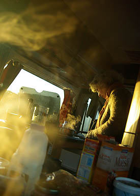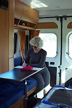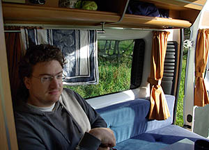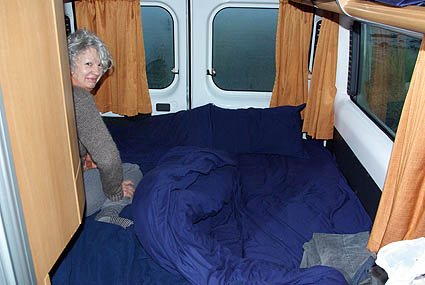 Un frigo, deux plaques au gaz et un plan de travail escamotable suffisent à Liliane pour bricoler de bons petits repas et des petits déjeuners qui font le régal des auto-stoppeurs occasionnels (bonjour notamment à Vincent d'Amsterdam, Augusto d'Argentine, Klaus d'Allemagne, Jeremy de Nouvelle-Zélande...). Quand on passe la nuit dans un camping, ce qui arrive quand même une fois tous les quelques jours pour les pleins d'eau et d'électricité de l'ordinateur et de l'appareil photo - et accessoirement prendre une douche avec plus de place que la mini-cabine - et qu'on est donc reliés au secteur, on dispose en plus, quel luxe ! du micro-onde, de la bouilloire électrique... et du chauffage ! Chauffage, soit dit en passant, qui peut s'avérer utile à partir d'avril car, saisons inversées obligent, on entre dans l'hiver. Et en montagne ou dans le sud, les nuits peuvent être frisquettes. ![]() Le soir venu, tandis que les auto-stoppeurs éventuels montent leur tente, la table devient le sommier du lit, les dossiers se font matelas, et on récupère les oreillers et la couette au-dessus de la cabine. Il ne reste qu'à tirer les rideaux...