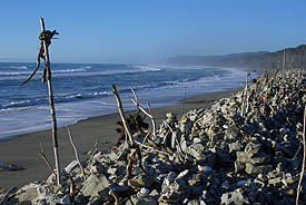 Sur la plage de Haast, des centaines de petits cairns de galets, parfois peints, gardent le souvenir des visiteurs de ce bout du monde.