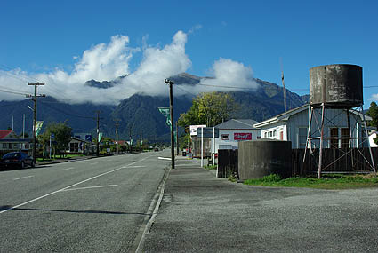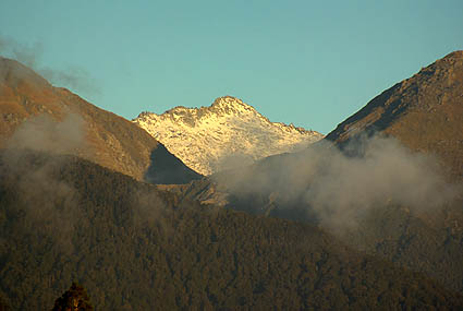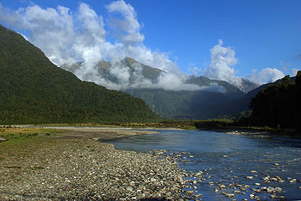 La rivière Haast, alimentée par les eaux de fonte, tapisse la vallée glaciaire jusqu'à la mer.