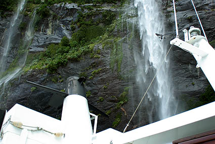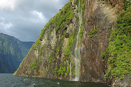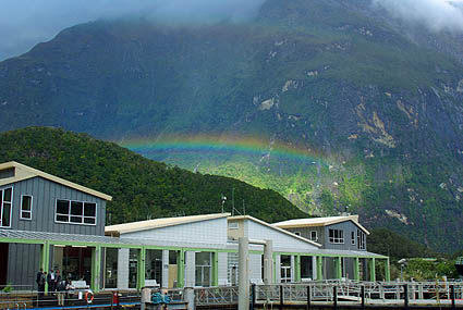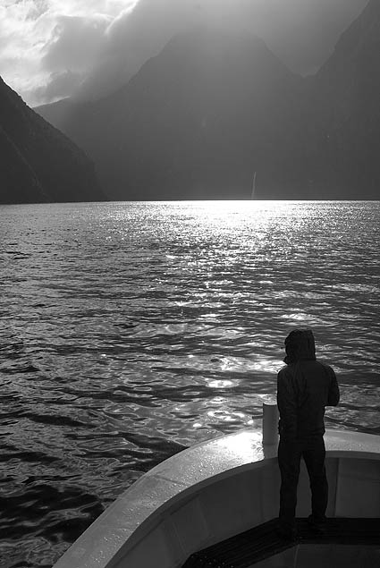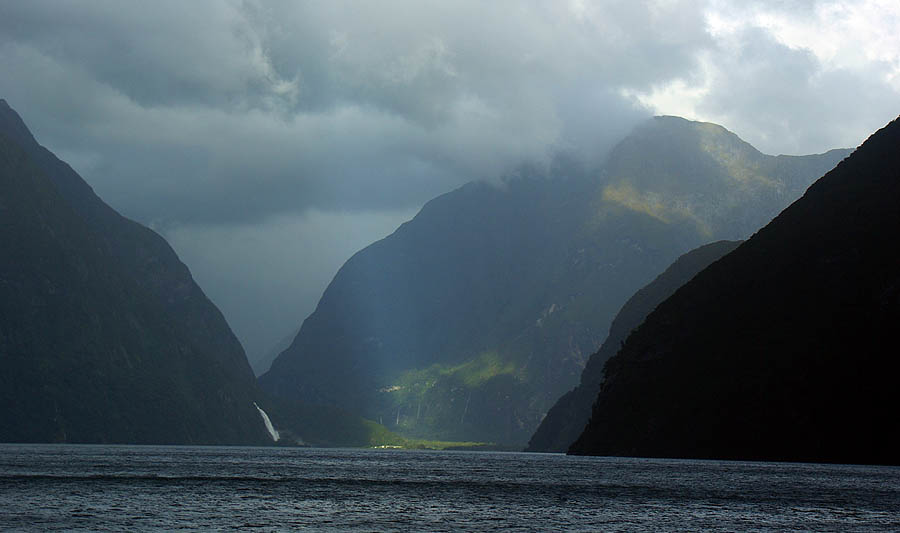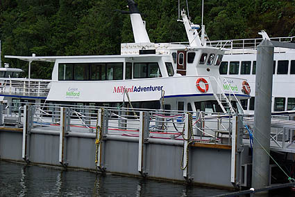 ![]() On arrive enfin au mini-port de Milford. Ce ne sont plus des navires de chasse au phoque, mais toutes les tailles de bateaux de "croisière" comme ils disent, en fait une balade d'une heure et demi le long de ce bras de mer au creux des montagnes. Le temps continue de changer à tout bout de champ, bruine, franche pluie, vent violent, soleil soudain... Mais cela permet de voir ce décor paré de différents costumes. Nous avons embarqué sur le Milford Adventurer, l'un des plus petits bateaux.