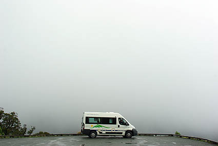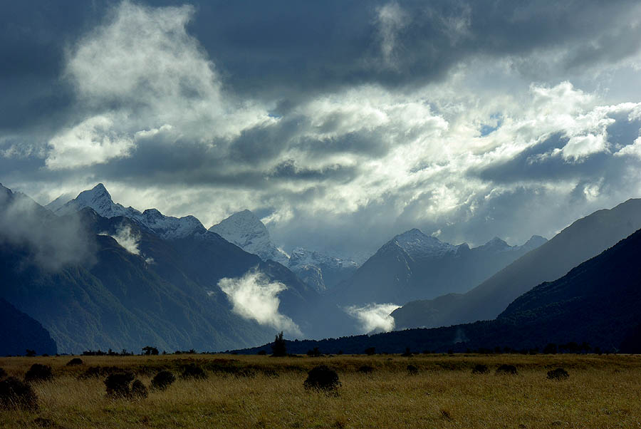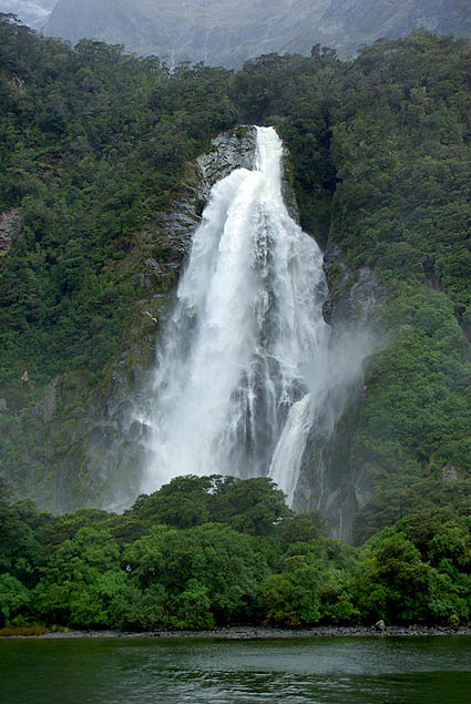 ![]() Une impasse de plusieurs centaines de kilomètres de long, telle est la route que l'on doit emprunter pour atteindre le Milford Sound, un fjord à la norvégienne lové dans l'une des parties les plus sauvages de la Nouvelle-Zélande. Autant que la destination elle-même, la route qui y mène, ouverte seulement en 1953, est exclusivement fréquentée par des touristes, et constitue une attraction en soi. Des chemins de randonnées très bien balisés en partent, pour quelques minutes ou plusieurs jours de marche dans le parc national "Fjordland", le plus grand du pays, et des curiosités géologiques sont l'occasion de pauses fréquentes. Il faut juste éviter de s'y arrêter en même temps que les énormes cars qui voyagent en escadrille pour emmener d'un seul bloc les touristes depuis Queenstown. ![]() Ci-dessous à gauche, le Mitre Peak fait 1692 mètres, d'autres grimpent jusqu'à 2750 mètres. A droite, le temps changeant à une vitesse extraordinaire, beau, pluie, brouillard, verglas, plein soleil, d'un virage à l'autre, on ne profite pas toujours du même paysage... ou du paysage tout court.