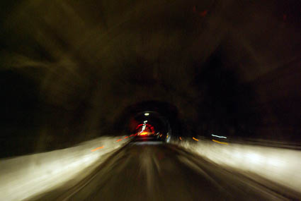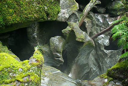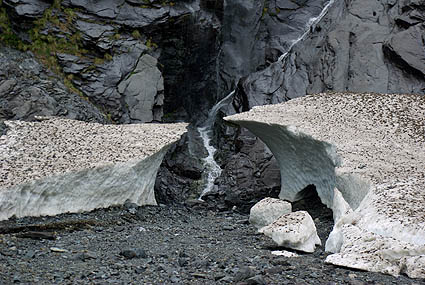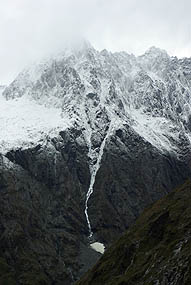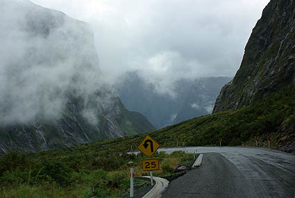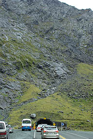 Ci-dessous, le Homer Tunnel, dont le sens de circulation change toutes les 15 minutes, long de 1219 mètres, passe sous des pics enneigés. Les cascades s'y changent en coulées de glace. A la sortie, gare aux pluies verglaçantes, même à faible allure on a fait un beau dérapage avec le campervan...