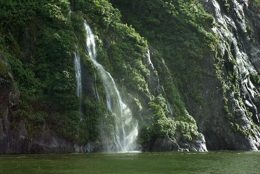 ![]() Les précipitations diluviennes de ces derniers jours avaient gonflé les innombrables cascades, dont la plus haute tombe de 160 mètres. Ce fjord a la particularité de cumuler plusieurs écosystèmes qui se superposent sans se mélanger : en surface, sur 5 à 6 mètres, l'eau est douce, alimentée par les pluies et les ruissellements des parois qui déversent ici tous les torrents des montagnes. En-dessous, l'eau salée de la mer remonte dans les terres. Plus bas encore, à plus d'une centaine de mètres de profondeur, une étrange poche douce à nouveau et sans vie. Seuls les dauphins passent d'une couche à l'autre.
