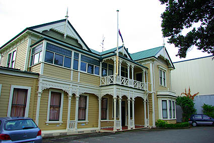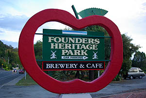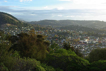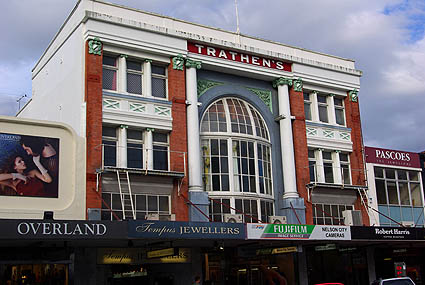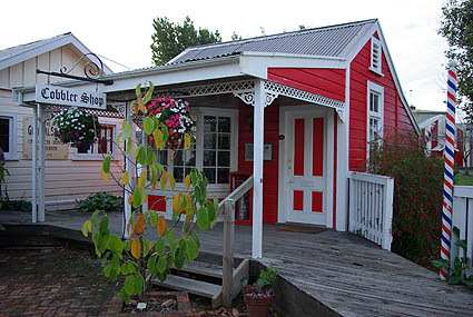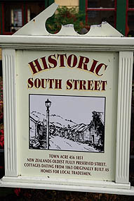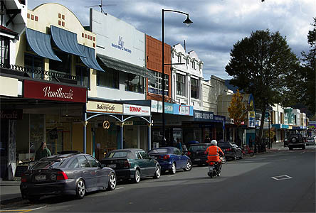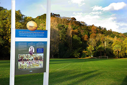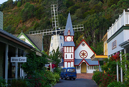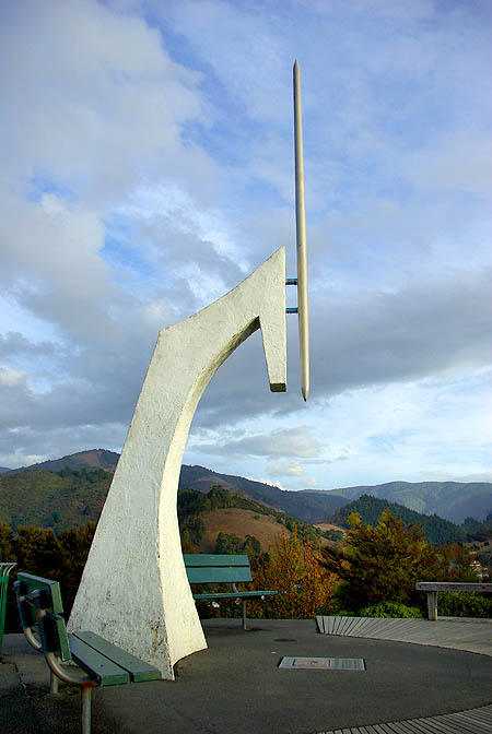 Ci-dessus à gauche, un endroit historique d'une importance capitale... pour les amateurs de rugby. C'est en effet le premier terrain du pays, où un match universitaire disputé le 14 mai 1870 a inauguré la passion des kiwis pour ce curieux sport anglais. Derrière le terrain s'élève une colline offrant une superbe vue sur la baie, le port et la Maitai Valley. ![]() En haut de la colline, ce monument des années 60 marque le centre géographique exact de la Nouvelle-Zélande, du moins le point de référence depuis lequel les distances sont mesurées. ![]() A la sortie de la ville, le Founder's Heritage Park propose un concept original : ce village reconstitué est animé par des gens en costume, avec des exemples de commerces et d'activités d'époque, mais dont certains sont réels ! Par exemple à la banque, tout droit sortie d'un album de Lucky Luke, on peut faire de vraies opérations, l'église est utilisable pour les mariages, il y a un vrai marché etc. On y trouve aussi une petite collection de véhicules anciens. Malheureusement, nous y sommes arrivés à la fermeture, et n'avons pu le visiter en pleine activité.