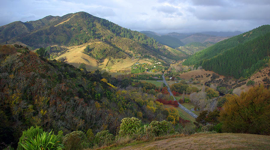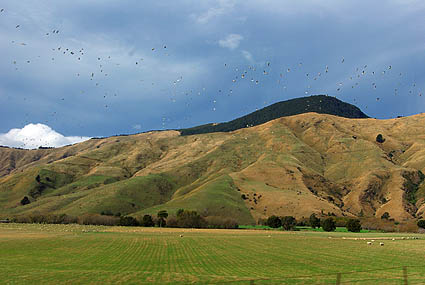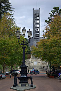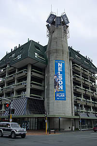 La Nouvelle-Zélande est très fière de ses vignes, et propose des "routes du vin" comme dans le Bordelais, avec dégustations itou. Mais bon, nous on ne boit pas, alors on se contente d'apprécier les couleurs automnales des paysages agricoles, sous une légère pluie. En longeant la côte vers le nord-ouest, on arrive bientôt à Nelson, nommée en l'honneur du célèbre amiral. Ci-dessous à gauche, le parking le plus moche du monde ! A droite, la cathédrale anglicane.