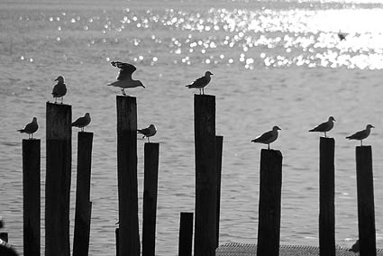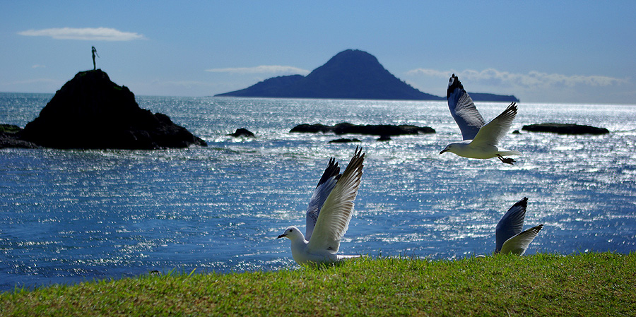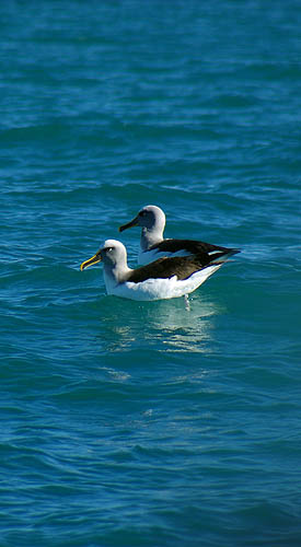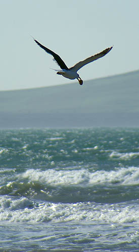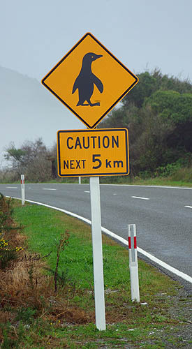 ![]() ![]() Les pingouins (techniquement des manchots, nous sommes dans l'hémisphère sud) sont nombreux à traverser sans regarder. Tout au sud, il s'agit surtout de blue penguins et de yellow-eyed penguins (manchots pygmées). Au contraire de ces oiseaux qui ne savent plus voler, les impressionnants albatros, d'une envergure dépassant parfois les trois mètres, peuvent rester des mois entiers en vol, ne se posant qu'à la saison des amours. A droite, un goéland essaie de briser un coquillage en le lâchant de plus en plus haut sur les rochers.