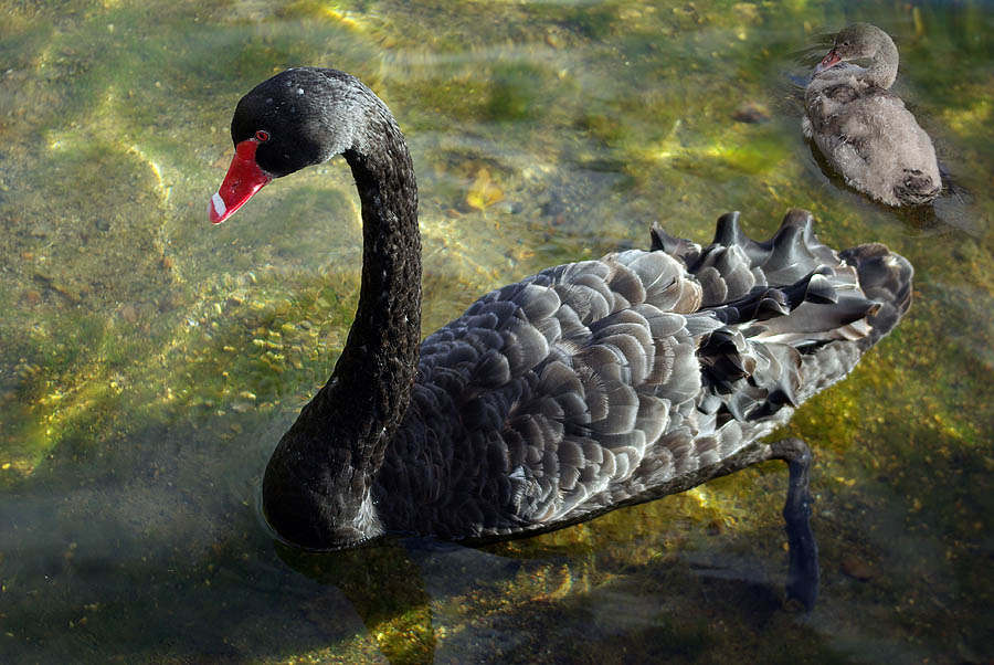 On voit souvent ces gracieux cygnes noirs, avec leurs plumes frisées, et en cette saison leurs petits. ![]()