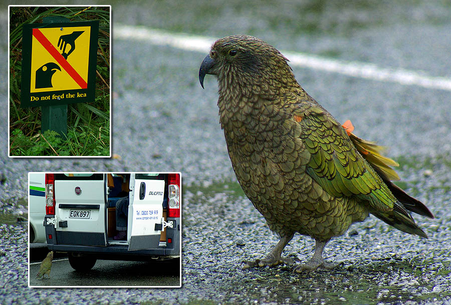 Un silvereye au parc Abel Tasman. Minuscule, rapide et de la couleur des feuilles, il n'est pas facile à repérer ! ![]() ![]() Ci-dessous, un fantail. Comme je ne suis pas une femelle à qui faire la cour, il n'a pas déplié pour moi sa longue queue en éventail, tel un paon miniature (il est gros comme une mésange). ![]() Le kea, plus gros des perroquets et l'un des animaux les plus intelligents qui soient, est doté d'un bec exceptionnellement tranchant et puissant. Il est sociable et très curieux, mais il ne faut surtout pas le nourrir. Le bougre vient faire la manche auprès des véhicules, mais si on l'habitue, il risque de faire de gros dégâts pour voler la nourriture - outre que nos aliments trop riches sont mauvais pour sa santé. ![]()