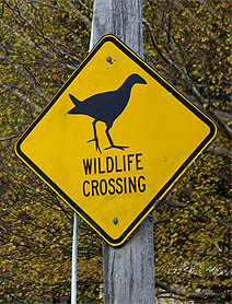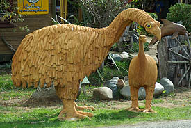 Ajourd'hui disparu, victime de la surchasse des Maoris, le moa (ci-dessous au centre) avait tant perdu ses ailes qu'il n'en restait aucune trace sur son squelette. Haut de trois mètres, ce gros poulet était une proie bien trop facile. A droite, nombre d'oiseaux jouent au roadrunner... une mauvaise idée de nos jours, même avec une circulation faible.