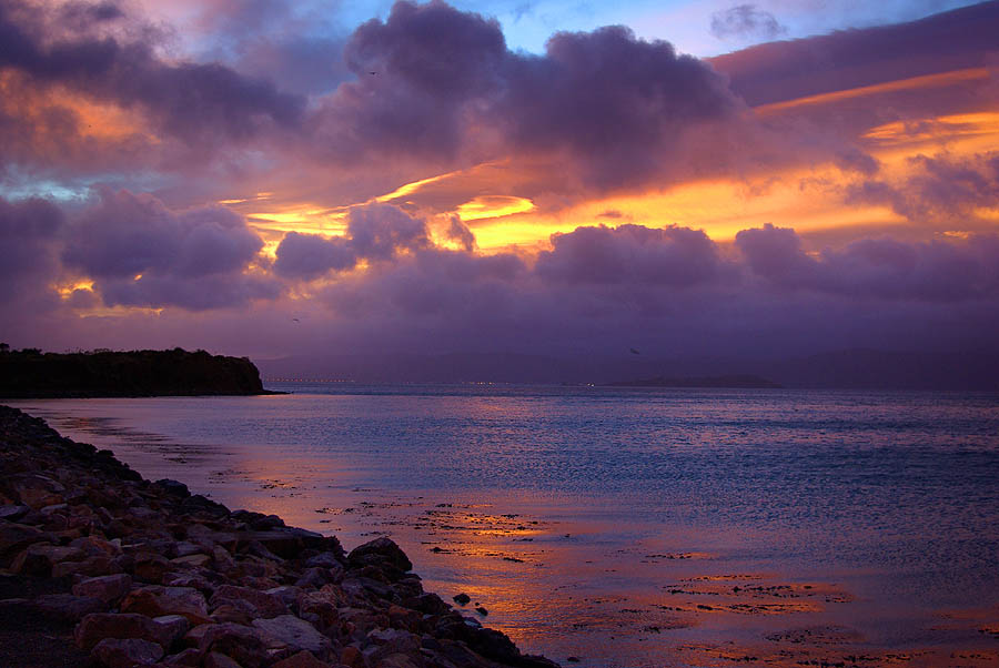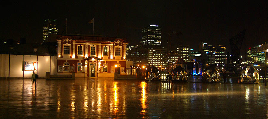 Ci-dessus à droite, un petit film interactif sur l'histoire d'une boutique, des premiers colons à aujourd'hui. Le décor de la salle prend vie en fonction de ce qui se passe à l'écran, c'est surprenant et amusant. Comme tous les musées de Nouvelle-Zélande, le Te Papa est gratuit, très accessible aux enfants et pédagogique. La muséologie est moderne et interactive, et bien que limitées comparées aux grands musées occidentaux, les collections sont variées et très bien présentées. La pluie ne cessant pas, et sachant qu'on partait tôt le lendemain, on a carrément passé la nuit sur le parking du musée, sans que ça pose problème, malgré les bourrasques incessantes venues de la mer. Le matin venu, non seulement il faisait beau, mais nous avons même eu droit à un lever de soleil particulièrement sublime, tandis que nous attendions d'embarquer sur le ferry pour l'Île du Sud. ![]() ![]() Traversée de trois heures tranquille sur une mer d'huile, à bord du beau et grand ferry ; l'arrivée à Picton rappelle les fjords de Norvège, avec des maisons isolées accessibles uniquement depuis la mer.
