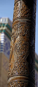 Ci-dessus à droite la Juma Masjid (Mosquée du Vendredi) avec sa forêt de 213 colonnes de bois sculpté, toutes d'âge et de motifs différents,