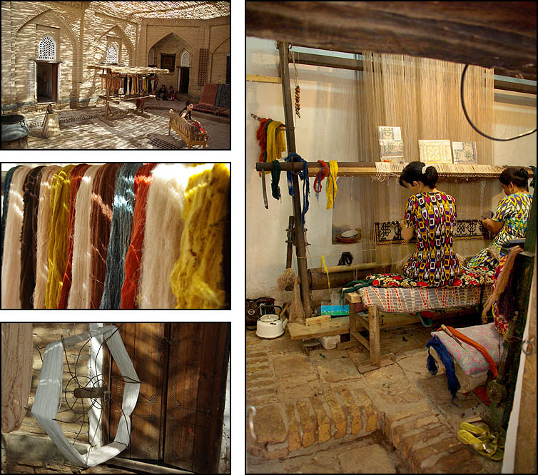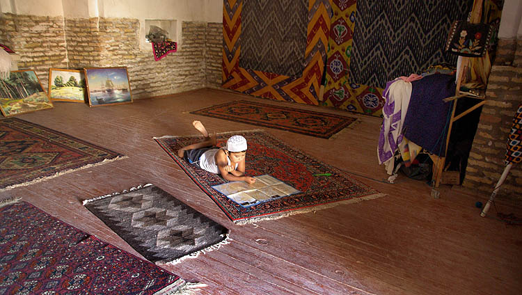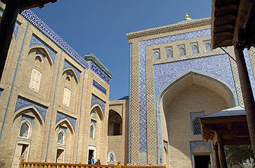 Ci-dessus, la madrasa Muhamad Rakhim Khan date de 1871. Elle abrite un centre artisanal présentant les productions locales : tapis, ébenisterie,