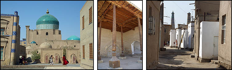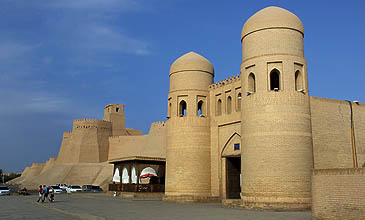 La vieille ville enserrée dans ses remparts se nomme Ichan Kala. Située à quelques kilomètres de la ville moderne d'Urgench, Khiva est une ville-musée où résident très