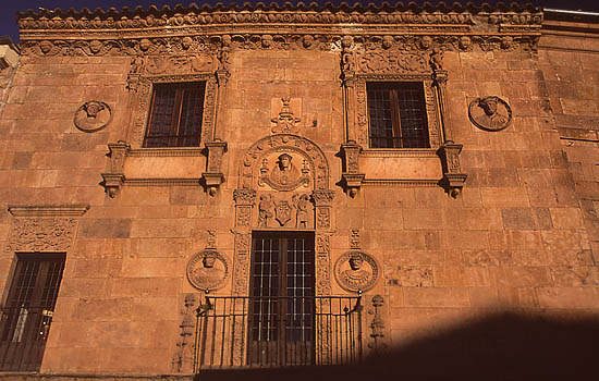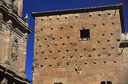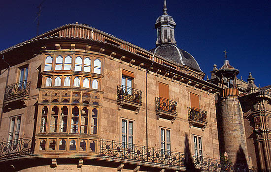 sera même assez fraîche, qu'importe. Le lendemain matin, on attaque toujours en tradition avec d'excellents "chocolate con churros". Hombre, los chocolates españoles ! La cuillère y tient presque droite, et c'est un vrai régal. Avec ça, on est parés pour la journée, et ça tombe bien parce qu'il y a énormément de choses à voir. ![]() En descendant l'avenue commerçante en haut de laquelle on est garé, on débouche sur la Plaza Mayor du XVIIIème, réputée la plus belle place baroque d'Espagne. Ses arcades sont ornées de macarons et de blasons (voir la vignette en haut à gauche). Salamanque est le siège de l'une des plus anciennes universités d'Europe. ![]()