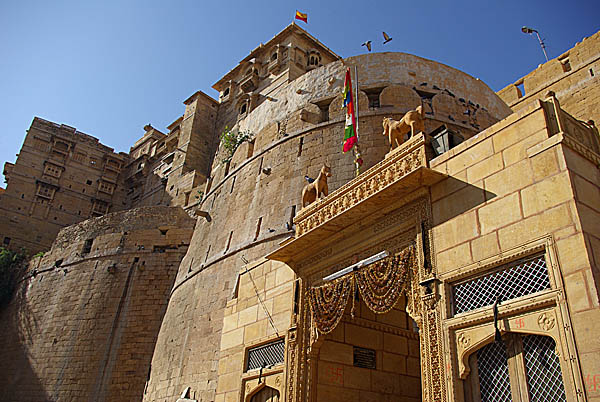 ![]() Jaisalmer, la cité d'or, a été fondée en 1158 et ses dynasties de maharajahs font remonter leur lignage à rien moins que Krishna en personne. Plusieurs fois assiégée, la ville n'a jamais été prise, mais en revanche, après un siège de neuf ans par l'empereur de Delhi, les habitants ont décidé de pratiquer le jauhar : les femmes se sont jetées dans les flammes, tandis que les hommes ont revêtu leurs robes safran pour se précipiter en une ultime charge contre les ennemis, vers une mort certaine. ![]() Les formidables remparts enserrent toujours la forteresse des Rajputs, mais elle est en grand danger car toute construite de briques crues, rongée de l'intérieur par la forte surexploitation de ses anciennes canalisations. Les multiples fuites sapent les fondations et oxydent les "agrafes" de métal qui remplacent le ciment. Plusieurs bastions du XIIème siècle se sont effondrés depuis 1993, et la consommation croissante d'eau (principalement liée au tourisme) continue ses dégâts. C'est pourquoi il est fortement conseillé de loger en dehors, outre que la vue sur les murailles est magnifique (voir les panoramiques à agrandir ci-dessous depuis le toit de l'hôtel Shahi Palace). ![]() ![]() Plusieurs énormes portes mènent dans une vaste cour, et c'est là qu'on découvre que la forteresse est encore habitée et pleine de vie. Ce n'est pas qu'un musée figé mais une véritable ville médiévale, avec de magnifiques havelis (riches maisons de commerçants), temples, palais, de nombreuses boutiques et tout un réseau de ruelles pavées très animées. ![]() Entre autres ingénieux systèmes de défense, ces boulets (ci-dessous) disposés en hauteur tout le long du chemin sinueux qui monte aux portes attendaient les envahisseurs. En cas d'alerte, il suffisait de les pousser dans la rue en pente pour qu'ils dévalent jusqu'en bas à la Indiana Jones, dissuadant toute montée. Ils étaient servis avec un accompagnement d'huile bouillante, sans oublier quelques volées de flèches pour pimenter le tout... ![]() ![]() ![]() Cliquez pour agrandir ![]() Cliquez pour agrandir ![]()