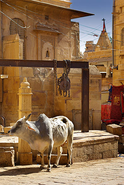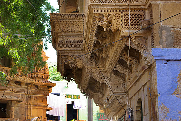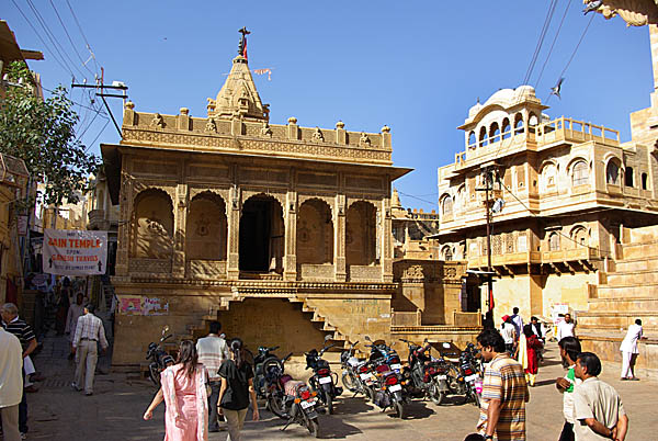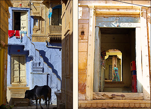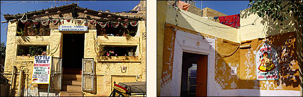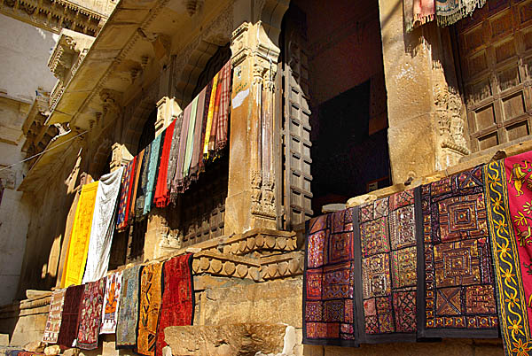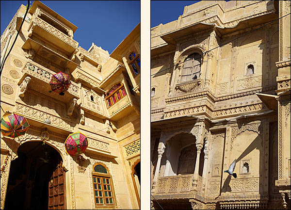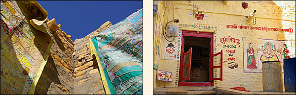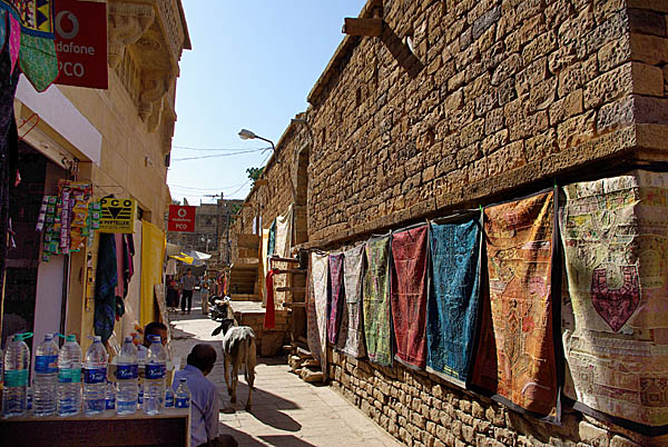 ![]() 25% de la population vit toujours à l'intérieur de la forteresse, classée à l'Unesco, qui est l'un des endroits les plus extraordinaires que l'on a visités en Inde. C'est comme un palais des Mille et Une Nuits qui émerge du désert et du temps. Les véhicules y sont interdits, bien que quelques motos se faufilent, mais c'est beaucoup moins bruyant qu'ailleurs. ![]() ![]() ![]() ![]() Dentelles de pierre et patchworks de saris égayent les façades centenaires, tandis que les marchands, sans trop insister heureusement, vantent leur artisanat touristique. Récemment, les cartes mémoires ont remplacé les pellicules bouillies au soleil, la moindre échoppe propose de graver vos photos sur CD, et la couverture de téléphonie mobile est impeccable. ![]() ![]() ![]() ![]() ![]() ![]() De nombreux réfugiés tibétains sont arrivés jusqu'à Jaisalmer, où ils vendent des objets traditionnels bien éloignés de l'art rajasthani. Ils ont aussi importé leur cuisine et l'on se régale de momos. En tous cas, la météo doit plutôt les changer ! En cette saison (fin novembre) la température est très agréable, mais en été elle peut dépasser 50°C. ![]() ![]() Vaches, veaux, chèvres, cochons y errent et partagent leurs festins de vieux journaux et débris divers avec les chiens et leurs chiots. Ce qui n'explique pas pourquoi ils sont tous plus propres et moins faméliques qu'ailleurs. ![]()