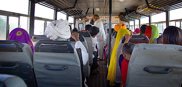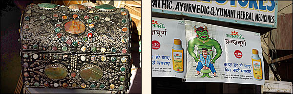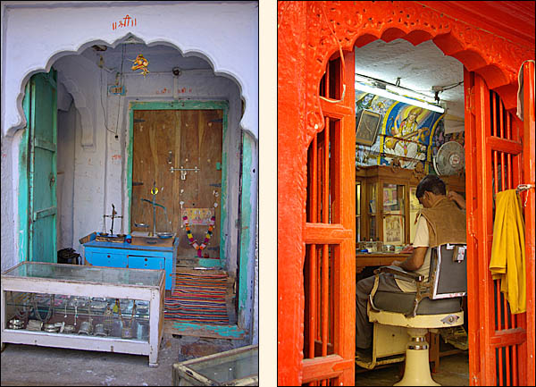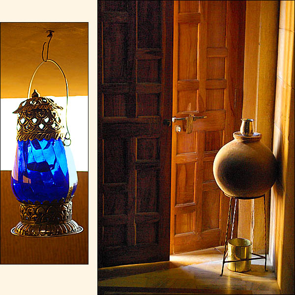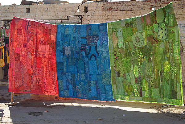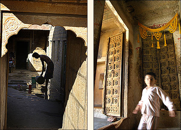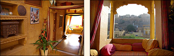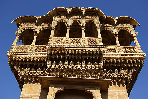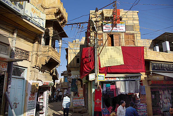 ![]() Le parasol sur le drapeau de la ville, symbole de Krishna, rappelle l'origine "divine" des Rajputs. Avec une population globale excédant nettement le milliard, les villes indiennes sont presque toujours énormes, mais avec seulement 58.000 habitants, Jaisalmer fait figure de village. Ici, pas d'immeubles modernes, pas de banlieues sinistres, mais le désert à des centaines de kilomètres à la ronde. Les quartiers plus récents sont bâtis dans la même pierre dorée, en respectant plus ou moins le style local. Bon, cela n'empêche pas les atroces panneaux publicitaires accrochés sur les façades centenaires ni les noeuds de fils électriques dans tous les sens, mais il y a quand même, jusque dans les ruelles excentrées, un certain charme où l'artisanat reste bien vivant. ![]() ![]() Escale dans un hôtel bien plus raffiné que notre moyenne habituelle. Le Shahi Palace offre une magnifique vue sur les remparts (ci-dessus) depuis sa terrasse où il fait bon s'attarder au coucher du soleil, et une décoration intérieure très agréable (ci-dessous). ![]() ![]() ![]() Face aux boutiques pour touristes, une femme rajastani colorée, bijoutée, maquillée, très belle, porte son bébé dans un berceau-hamac, et mendie. ![]() ![]() Le Salim Singh-ki-Haveli, vieux de 300 ans, est ouvert aux visites par la famille qui y habite toujours. Si la demeure est superbe, elle est en triste état et menace un peu de s'effondrer sur les visiteurs ! ![]() ![]() A gauche, les toits-terrasses du haveli. A droite, une maison traditionnelle, où l'on fait toujours la cuisine sur le toit, à l'aide d'un tout petit feu de bois. ![]() ![]() ![]() ![]() Etant donné le manque de bois de construction et d'eau pour le ciment, le métier de tailleur de pierre est toujours d'actualité. La pierre dorée de la région sert à tout, même à faire de simples palissades. ![]() ![]() La télévision est hystérique ! C'est une succession frénétique d'extraits d'émissions, de films, de chansons, de danses hyper suggestives avec des beautés sublimes en bikini ou en sari mouillé, d'actualités, de flux boursiers, de jeux, de shows, de publicité, de présentateurs haut débit, qui s'enchaînent à un rythme étourdissant. Et en zappant, il arrive en contraste saisissant de tomber sur des îlots statiques de prêcheurs de diverses religions, psalmodiant en plan fixe d'interminables litanies. On quitte à regret la cité d'or pour reprendre un bus, pas trop bondé pour une fois, vers la cité bleue, Jodhpur. ![]()