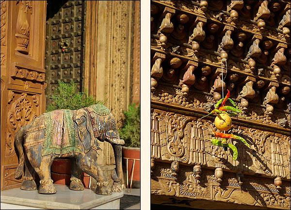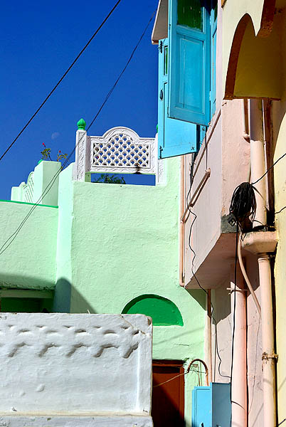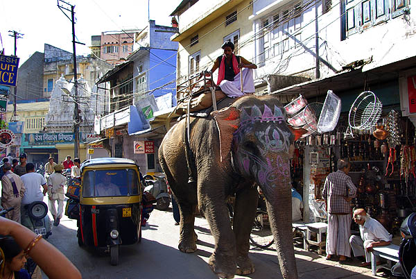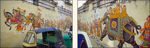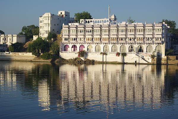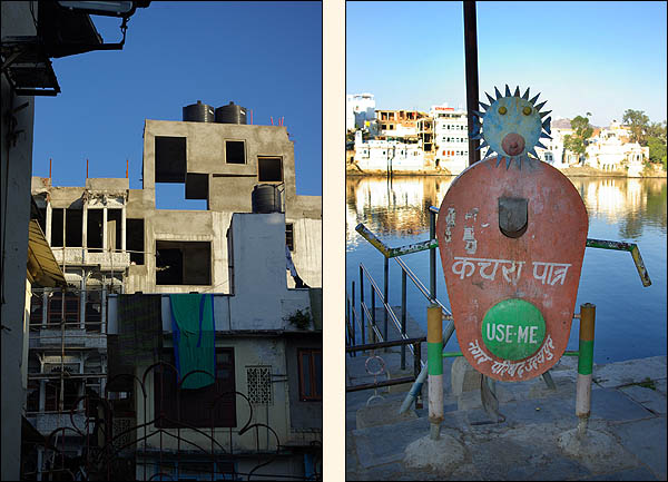 ![]() La ville d'Udaipur est sise dans une vallée entourée par les collines Aravali, sur les rives du lac Pichola. Elle est célèbre notamment pour son "Lake Palace", un ancien palais "flottant" converti en hôtel de grand luxe. Lorsque le lac s'assèche en cas de mousson insuffisante, il a plutôt l'air échoué dans une mer de boue, mais nous l'avons découvert comme il doit l'être, vision de rêve posée sur les eaux sereines tel un lotus sur un bassin divin... Oh c'est beau, non ? Y passer la nuit est un "must" romantique. Cependant il faut disposer du budget adapté : plus de 1000 dollars pour une chambre avec vue. ![]() Fondée en 1568 par Udai Singh II, après qu'un saint homme méditant sur une colline lui ait désigné l'endroit parfait, on l'appelle la ville blanche, quoiqu'elle ait tendance a se teinter de rose, de bleu, de jaune, de vert... à l'indienne, quoi. ![]() Ces dernières années, la ville monte. Pas à l'assaut des collines, mais à la recherche d'une vue toujours meilleure sur le lac, de toujours plus de place pour les touristes. Du coup, des tours maigrelettes poussent comme des Lego de béton pas très élégants ni bien finis. Chaque hôtel (et ils sont nombreux) vante SA terrasse, la plus haute, la plus grande, la plus proche du lac, etc. C'est en partie à Udaipur que fut tourné le James Bond "Octopussy", lequel est projeté en boucle dans plusieurs hôtels. ![]() Ci-dessus à droite, "ceci est une poubelle", malheureusement sans fond. Un exemple artistique des efforts de préservation du lac et de l'environnement. Les toits se dotent (enfin !) de panneaux solaires, et de façon générale la ville est quand même particulièrement propre - tourisme oblige ? ![]() Un bras du lac remonte dans la ville comme un canal, donnant un petit côté vénitien aux palais (généralement devenus des hôtels) qui le bordent. ![]() ![]() ![]() ![]() ![]() ![]() Pour une ville blanche, elle arbore aussi de jolies couleurs layette. ![]() ![]() ![]() ![]() ![]() Udaipur est également réputée pour son artisanat, notamment de très fines peintures de style mogol, des marionnettes, des tissus, et des sculptures sur bois. ![]() ![]() ![]() ![]() ![]() ![]() Non loin du palais royal, Jagdish Temple contient une statue de Vishnou en pierre noire. ![]() ![]() Quelques uns des 3.000.000 de dieux du panthéon hindou, dans le Jagdish Temple. ![]()