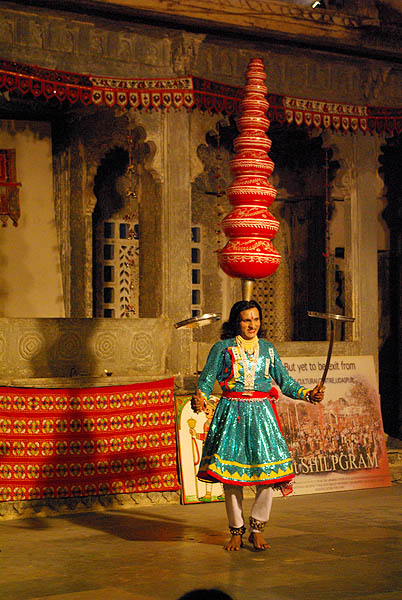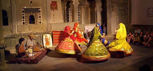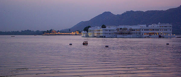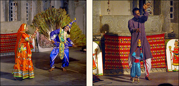 ![]() Le City Palace domine la ville et le lac où sombre le soleil. Au centre de l'eau, comme un paquebot de marbre, le Lake Palace se teinte de rose avant de se couvrir de lumières, c'est assez féérique. ![]() ![]() ![]() Face au palais le Jagdish Temple (temple de "Vishnou sous la forme de Jagannath" - seigneur de l'univers, rien que ça) étincelle et pousse ses innombrables haut-parleurs bien au-delà de leur saturation. Lorsqu'on grimpe son grand escalier, les femmes présentes nous invitent à participer à la cérémonie qui s'y déroule, chants un peu hypnotiques et prières dans une atmosphère à la fois sereine et joyeuse, très conviviale. La photo ci-dessus est prise depuis le "roof-top" du petit restaurant Anna, que l'on mentionne avec plaisir car on y mange bien, pour pas cher, et le patron est très gentil. ![]() ![]() Quand la nuit devient noire, les projecteurs s'allument sur les monuments et les palais, qui semblent plus que jamais flotter comme dans un rêve. ![]() ![]() ![]() ![]() ![]() ![]() Nous avons assisté à un spectacle de danses et de marionnettes rajasthanies. Danses du paon, du feu (une danseuse évolue avec une jarre enflammée sur la tête) , des clochettes, de Krishna, de l'eau... ![]()