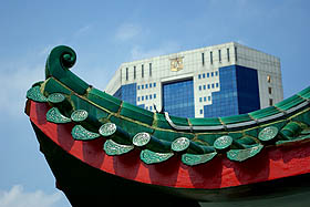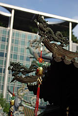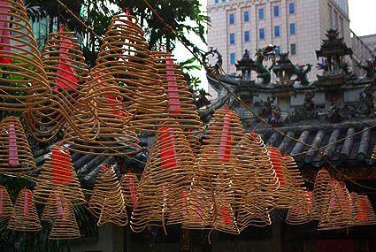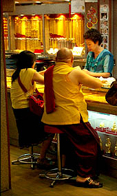 Dans le reste de la ville, d'autres temples et pagodes sont en activité. On croise pas mal de bonzes (dont celui ci-dessous dans une bijouterie). Les spirales d'encens, les dragons colorés et les motifs compliqués contrastent avec les austères façades de verre.