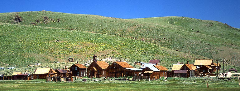 Bodie "Good bye God, I'm going to Bodie" (Je te quitte mon Dieu, je pars à Bodie) Cette phrase, écrite par une fillette que sa famille emmenait dans cette ville de perdition, devint célèbre dans tout l'Ouest. Bodie, fondée vers 1859 par les prospecteurs qui venaient "voir l'éléphant", c'est-à-dire chercher de l'or, abrita bientôt 10.000 habitants et acquit une réputation de perversité et de criminalité sans égale. En outre, passer de 40°C l'été à -40°C l'hiver ne devait pas faciliter la vie ! ![]()
